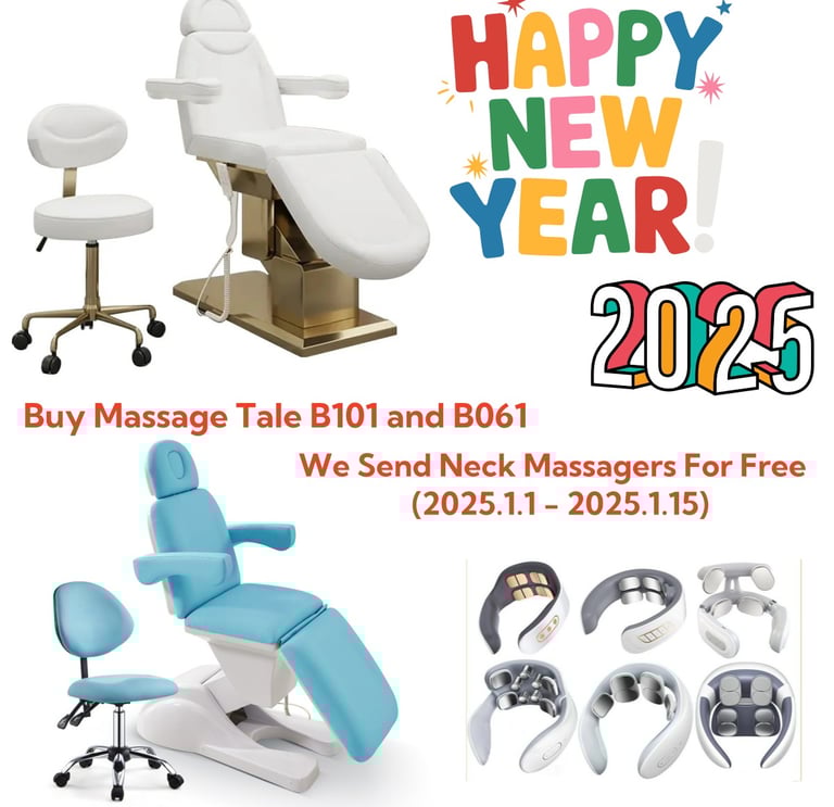 As we step into the new year, Foshan Liming Furniture is ringing in 2025 with an exciting New Year’s Day promotion that will help you start the year in comfort and relaxation. Whether you're a professional massage therapist or someone who enjoys unwinding at home, this offer is too good to miss. From now through the New Year period, customers who purchase the Massage Table B101 or Massage Table B061 will receive a luxury electric neck massager absolutely free. This is the perfect way to complement your new massage table and take your relaxation experience to the next level!